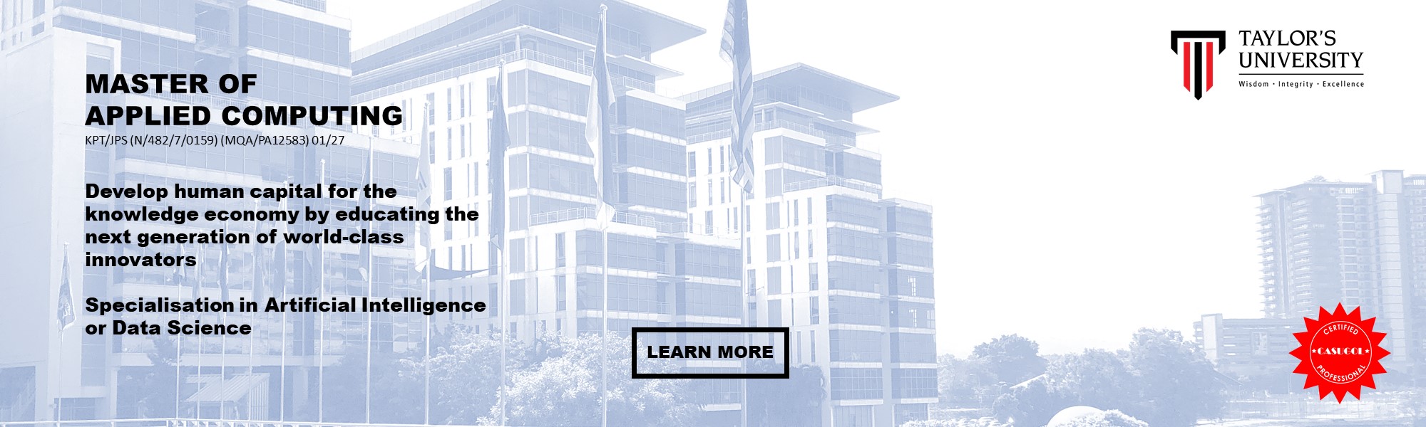 Master of Applied Computing (MAC) by Taylor’s University and supported by CASUGOL is the first step to becoming the next generation of world-class innovators with expert knowledge and industry experience in Artificial Intelligence and Data Science.
